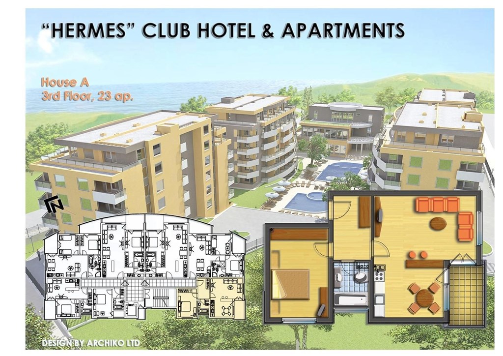 Dovolujeme si Vám nabídnout apartmán 2+kk v komplexu Hermes Club Hotel and Apartments v Carevu. Jde o kombinaci dvou budov s 80 apartmány v osobním vlastnictví a dvou budov 4hvězd. klubového hotelu s nabídkou řady vysoce kvalitních služeb a aktivit. Je to ojedinělá možnost letního bydlení v krásném a příjemném prostředí slunného Bulharska, jen 60 metrů od jedné písečné pláže, 300 m od další pláže, ale současně i v klidném prostředí jen 200 m od centra městečka Carevo. Apartmány mají vysoký standard provedení, mají různě velikosti a jsou umístěné ve dvou sedmipodlažních budovách. Většina apartmánů má krásné výhledy na moře ať už přímo z oken nebo z prostorných balkonů a teras. Nejmenší apartmány mají 49,7 m2, nejprostornější mají včetně teras 142 m2. V každé budově jsou čtyři malá studia o velikosti 27m2. Apartmány jsou vybaveny kuchyňskou linkou (studia ne) , veškerým nábytkem, klimatizací, televizi a dalšími spotřebními předměty. Veškerá občanská vybavenost je v místě nebo v blízkém okolí. Do centra Careva, za nákupy nebo zábavou to není pěšky dál než pět minut a na silnici spojující Carevo s Burgasem jste autem za tři minuty. Sportovní vyžití, kromě možností v areálu, nabídne především samotné moře, město Carevo s dalšími sportovišti.