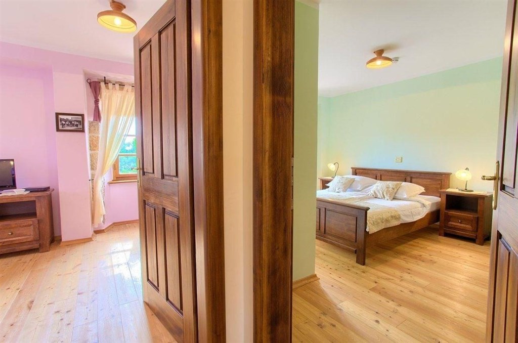 V přízemí se nachází obývací pokoj s krbem, kuchyňským koutem a jídelnou, dvě komory, toaleta a velká koupelna. Z obývacího pokoje projdete na krytou terasu s posezením. Vnitřními schody se vydejte nahoru do prvního patra, v němž naleznete tři komfortní ložnice a koupelnu.