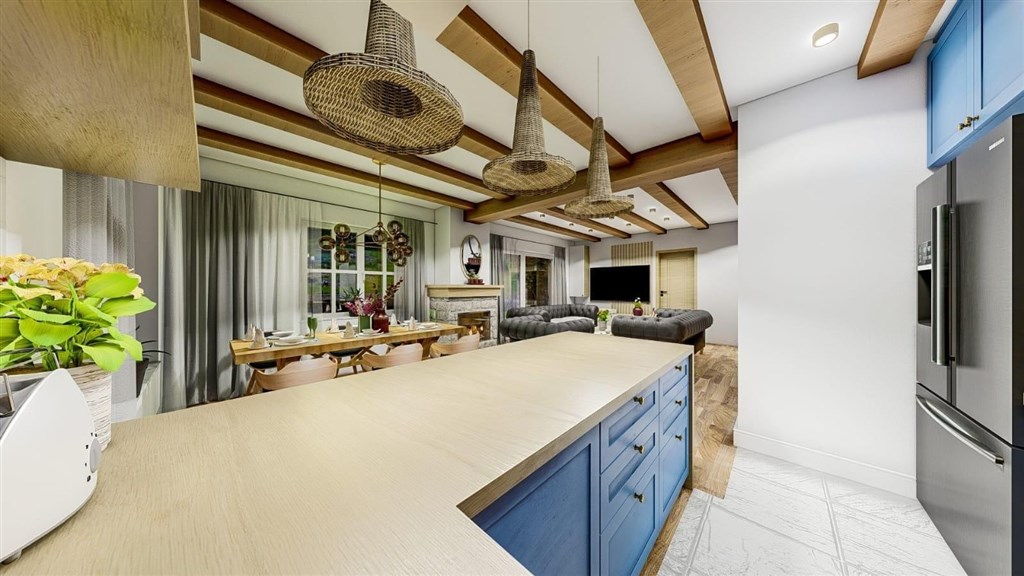Dům sestává z přízemí a 1. patra. V přízemí je chodba, komora, WC, 1 ložnice s koupelnou a kuchyň s jídelnou a obývacím pokojem. Z obývacího pokoje se dostanete na krytou terasu s letní kuchyní.