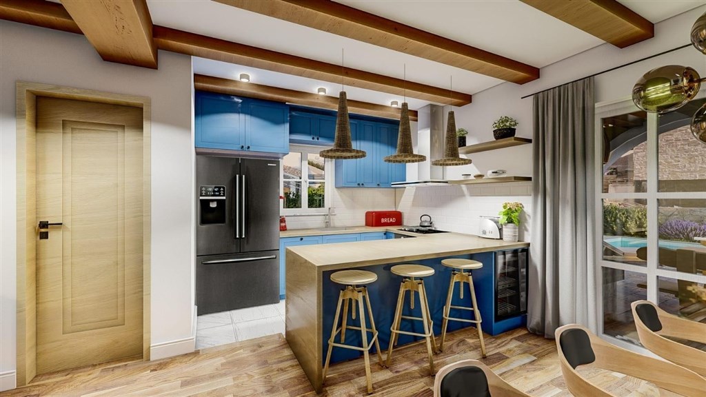 Dům bude vybavený klimatizací ve všech pokojích, kvalitními podlahovými krytinami, bude mít vnitřní a venkovní krb, udržovanou zahradu a bazén. Bude postavený ve středomořském stylu, připojený na vodovodní řád a na pozemku budou 2 parkovací místa. Nemovitost je vzdálená od centra města cca 500 m a od moře přibližně 1,5 km.