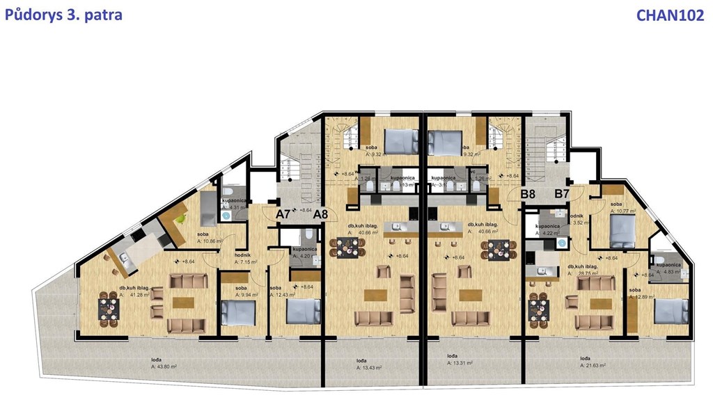 A4I: 3. patro, 149,23 m2, obývací pokoj s jídelnou a kuchyňským koutem, tři ložnice, tři koupelny, terasa; 675.000 €