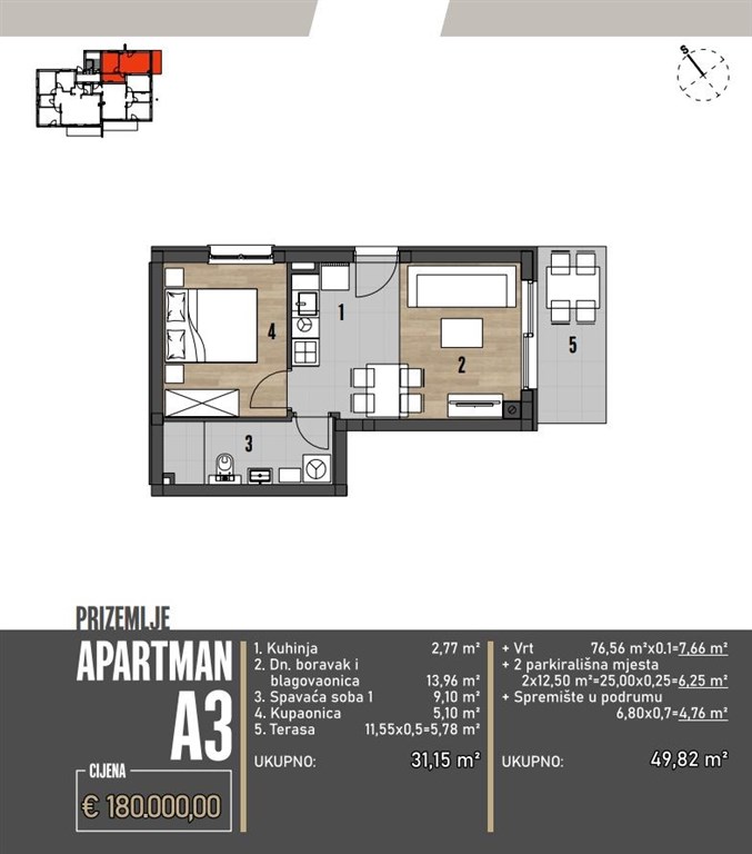 A3: přízemí, 49,82 m2 (kuchyň + jídelna + obývací pokoj, koupelna, 1 ložnice, terasa, předzahrádka, sklepní kóje, 2 parkovací místa) – 180.000 €