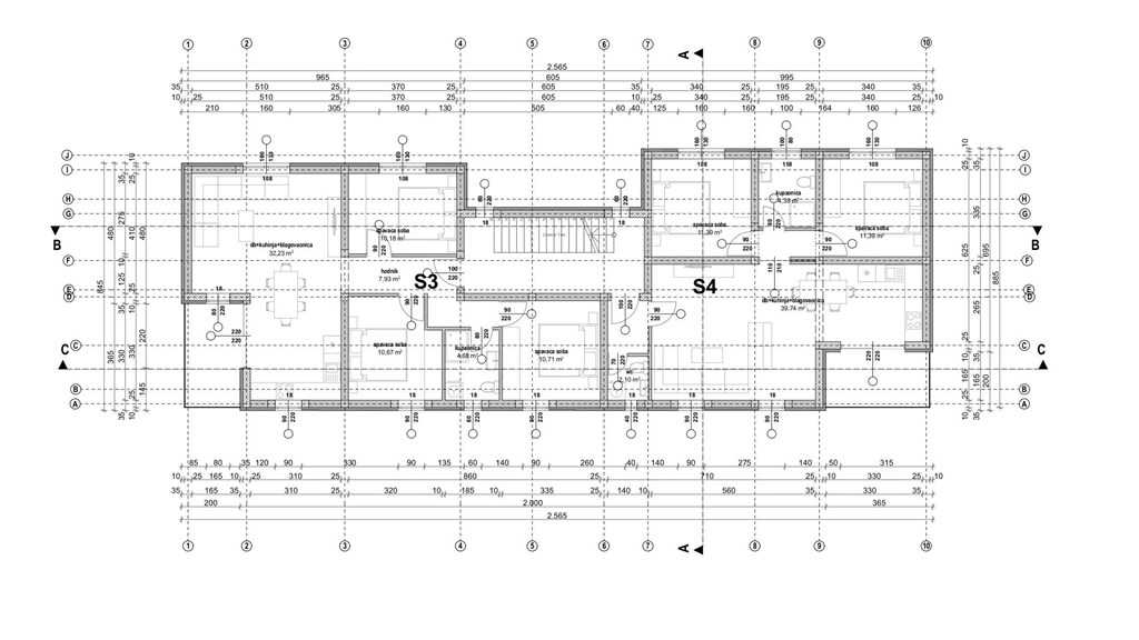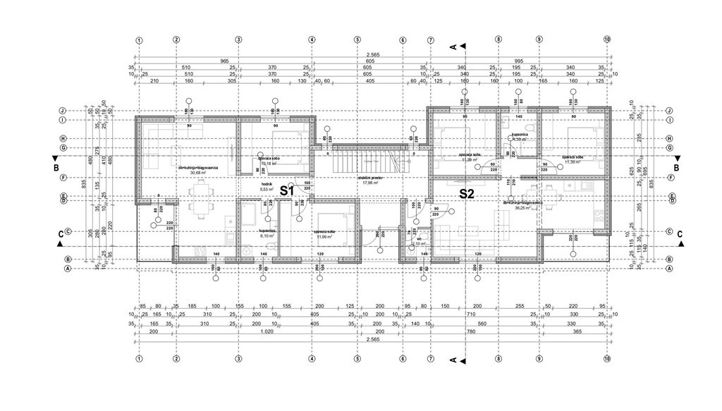 S1 – 84,77 m2 (chodba, 2 ložnice, koupelna, kuchyň + jídelna + obývací pokoj, terasa, předzahrádka, 2 parkovací místa) – 279 741 €