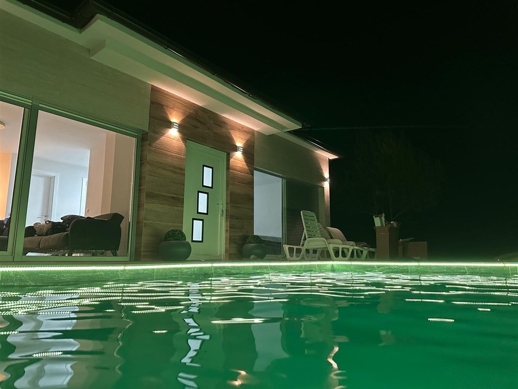 Dům o zastavěné ploše 65 m2 stojící na pozemku o rozloze 190 m2, sestává z obývacího pokoje s kuchyní a jídelnou s přístupem na bazén a terasu, dvou ložnic, koupelny a prádelny. Dům má 1 parkovací místo.
