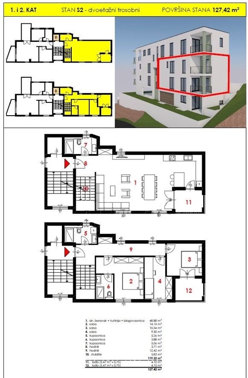 Apartmán S2 o celkové ploše 127,42 m2 je umístěný v 1. a 2. patře budovy, která se skládá ze suterénu s úložnými prostory, přízemí s krytými a venkovními parkovacími místy a 3 dalšími patry. Apartmán sestává z chodby, schodiště, tří ložnic, tří koupelen, dvou lodžií orientovaných na sever o celkové rozloze 10,94 m2 s krásnými výhledy na pohoří Biokovo a obývacího pokoje a kuchyně s jídelnou. Při stavbě a interiérovém vybavení apartmánů jsou použitý pouze materiály nejvyšší kvality. Špičková tepelná a zvuková izolace, elektrické rolety, bezpečnostní vstupní dveře, klimatizace, koupelny vybavené podlahovým vytápěním a keramikou 1.třídy, kvalitní parkety a keramická dlažba. K apartmánu lze dokoupit krycí parkovací stání za 15 000 € nebo venkovní parkovací stání za 10 000 €.