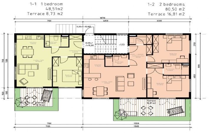 Každá vila má 3 patra. V prvním a druhém patře se nacházejí apartmány s 12 ložnicemi. Ve třetím patře se nachází exkluzivní penthouse s prostornou střešní terasou, která nabízí fantastický výhled na okolí a možnost užívat si vířivku. Všechny apartmány jsou nezařízené, což ponechává prostor pro personalizaci. Pro maximální pohodlí je instalována klimatizace. Podlahové vytápění v kuchyni a koupelnách.