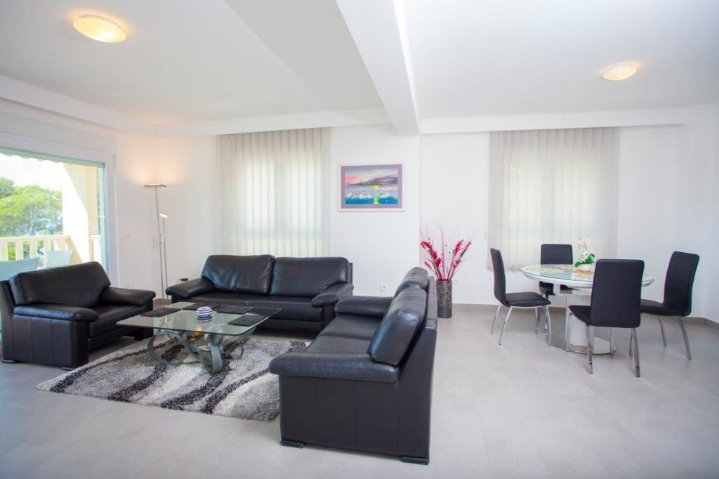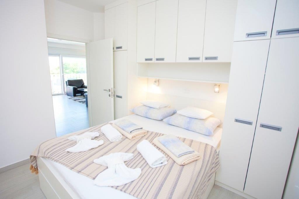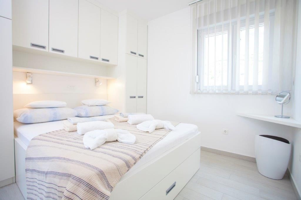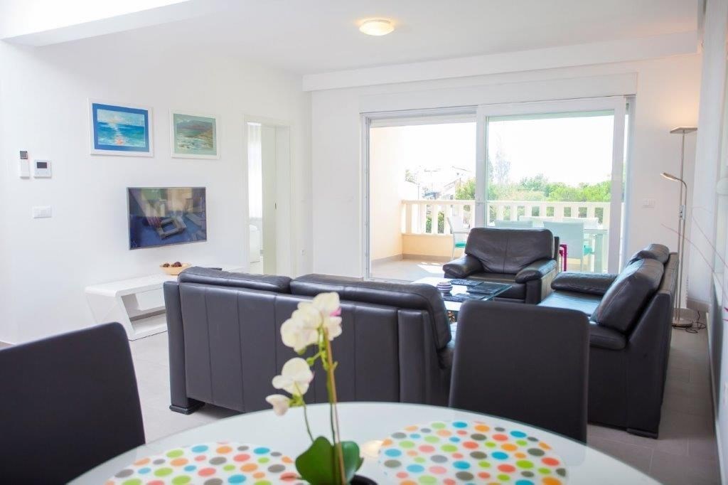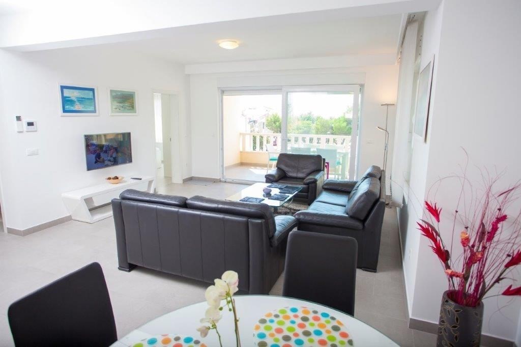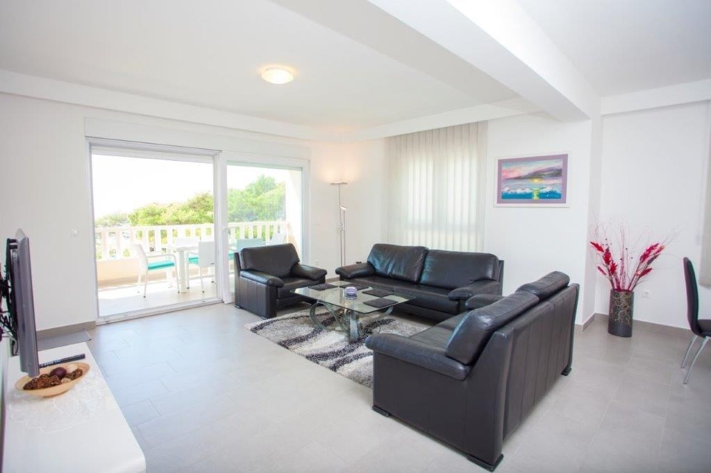 Apartmán o ploše 77,55 m2 se nachází ve druhém podlaží nově postavené čtyřpodlažní budovy s výtahem a sestává z technické místnosti, dvou ložnic, dvou koupelen, obývacího pokoje s kuchyní a jídelnou s přístupem na prostornou terasu o rozloze 12,50 m2 orientovanou na jih s krásným výhledem na moře a ostrovy. Apartmán je kompletně zařízený kvalitním nábytkem, kamennou a keramickou dlažbou, plně vybavenými koupelnami, klimatizací, podlahovým vytápěním v celém apartmánu, má bezpečnostní vstupní dveře, nerezové zábradlí, saelitní TV, internetové připojení, Budova má kvalitní tepelnou a zvukovou izolaci, Při stavbě a interiérovém proedení byly použity nejkvalitnější materiály. K apartmánu náleží jedno venkovní parkovací stání.