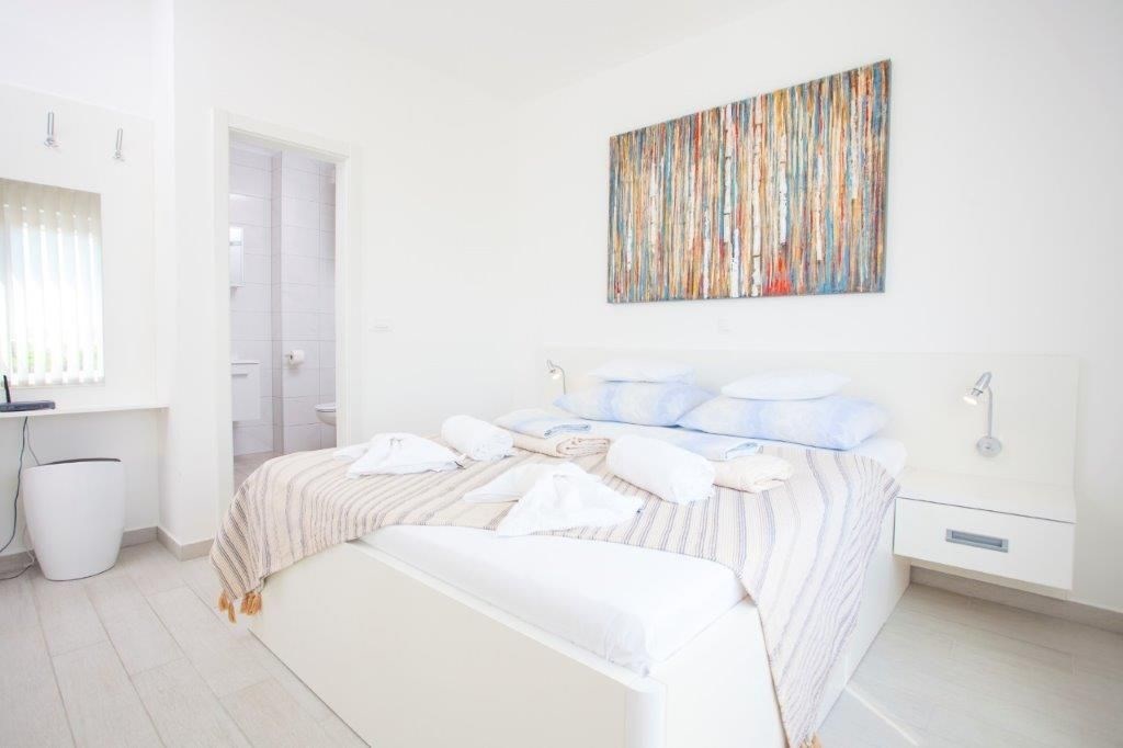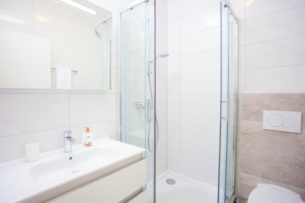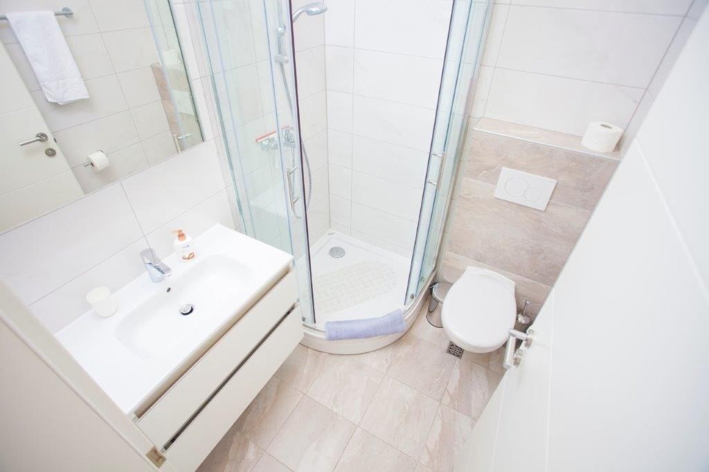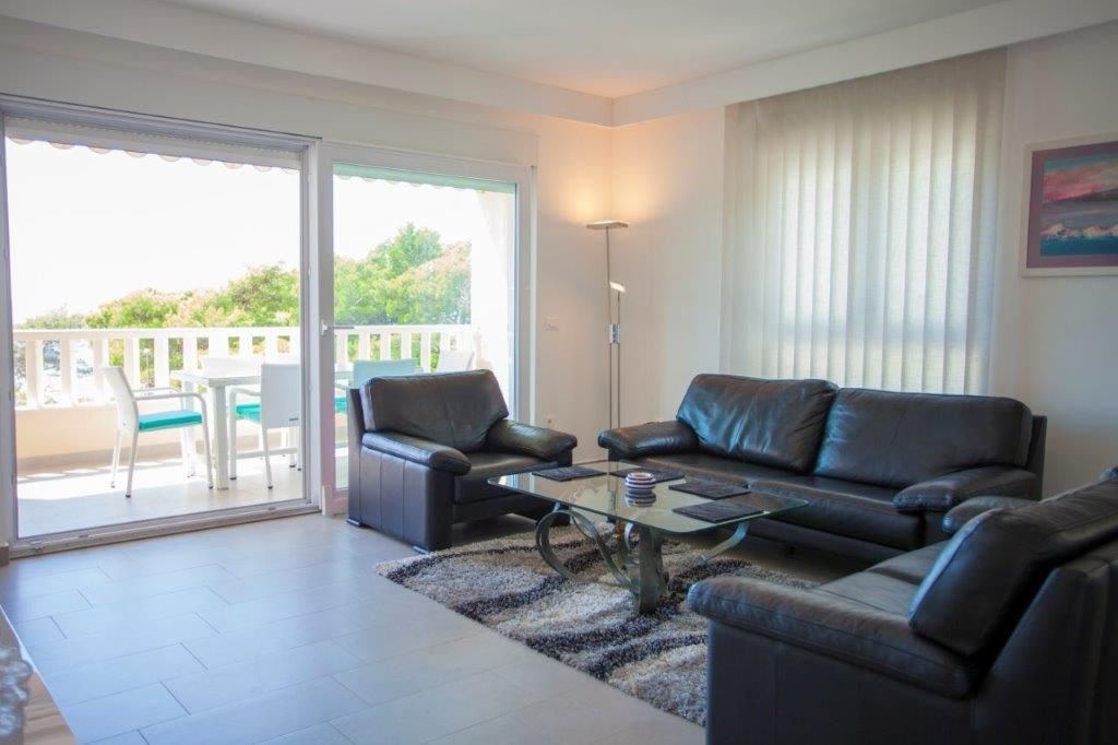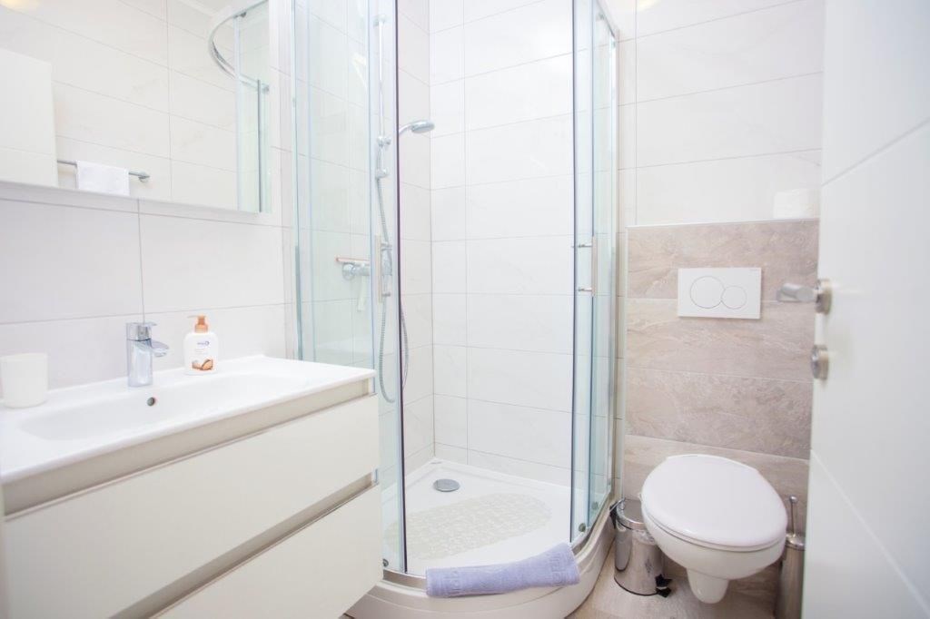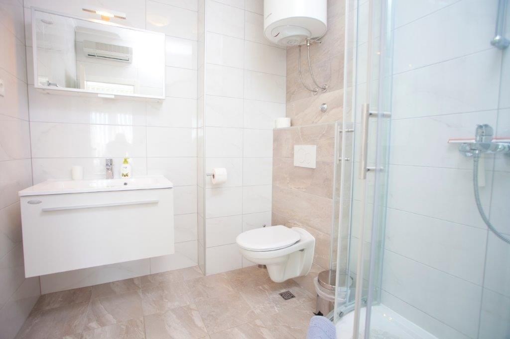 Apartmán o ploše 77,55 m2 se nachází ve druhém podlaží nově postavené čtyřpodlažní budovy s výtahem a sestává z technické místnosti, dvou ložnic, dvou koupelen, obývacího pokoje s kuchyní a jídelnou s přístupem na prostornou terasu o rozloze 12,50 m2 orientovanou na jih s krásným výhledem na moře a ostrovy. Apartmán je kompletně zařízený kvalitním nábytkem, kamennou a keramickou dlažbou, plně vybavenými koupelnami, klimatizací, podlahovým vytápěním v celém apartmánu, má bezpečnostní vstupní dveře, nerezové zábradlí, saelitní TV, internetové připojení, Budova má kvalitní tepelnou a zvukovou izolaci, Při stavbě a interiérovém proedení byly použity nejkvalitnější materiály. K apartmánu náleží jedno venkovní parkovací stání.